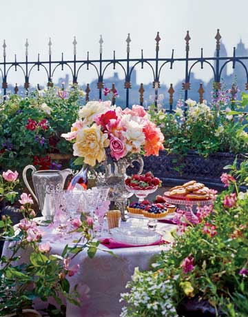 No backyard! Rooftop can be as lavish as this. All the flowers not only look good they make us feel good. The crystal and vintage table cloth all look so dainty.